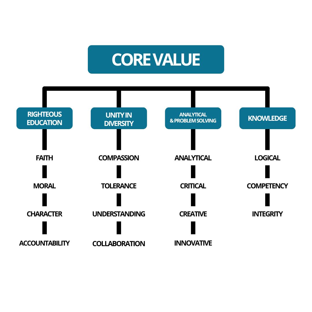 There are four values to education, focusing on developing a “virtuous mind.” The four values consist of Righteousness, Unity in Diversity, Analytical and Problem-Solving, and Knowledge.